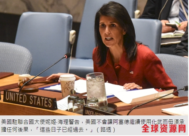 美國駐聯合國大使妮姬‧海理(Nikki Haley)7日在安理會的緊急會議上發出措詞強硬的警告,「美國昨晚已採取十分慎重的行動,我們已作好準備採取更多行動,不過我們希望無需要這些行動。」