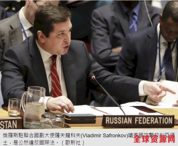 而俄羅斯則反指美國並未尋求安理會授權採取軍事行動,駐聯合國副大使薩夫龍科夫(Vladimir Safronkov)反嗆美國攻擊敘利亞領土,是公然違反國際法,是一次侵略行動。