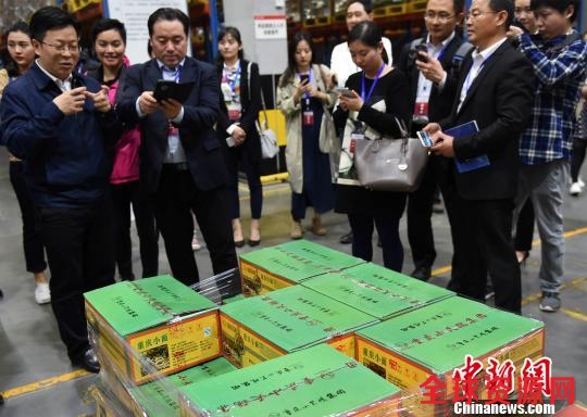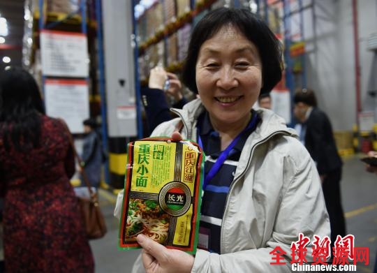 西部物流园一货品仓库里的麻辣小面吸引海外华文媒体高层眼球。 周毅 摄