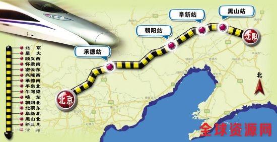 京沈高铁是《中长期铁路网规划》“四纵四横”客运专线主骨架京哈高速铁路的重要组成部分,线路自北京铁路枢纽星火站引出,途经河北省承德市,辽宁省朝阳市、阜新市后接入沈阳铁路枢纽沈阳站。京沈高铁线路全长697.626公里,总投资1245亿元。