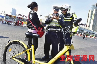 图片说明:昨天上午,机动支队交警和静安交警在中兴路普善路开展联合执法,对违法骑行共享单车的骑车人进行教育和处罚。