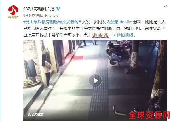 #昆山爆炸楼房倒塌#突发!据网友@深港-depths 爆料,刚刚昆山人民路玉峰大厦对面一装修中的店面房突然爆炸倒塌!伤亡暂时不明。消防特警已出动展开救援!希望伤亡可以小一点!