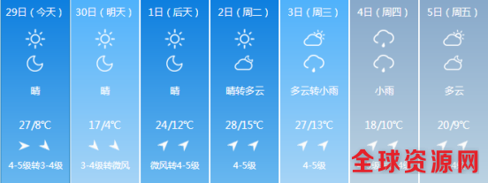 29日白天,吉林省中西部地区最高气温为26~28℃,其它大部分地区20~23℃;夜间白山地区最低气温为5℃左右,其它大部分地区6~10℃, 预计29日白天到夜间,吉林省大部分地区有4~5级偏西风,瞬间风力可达6~7级。