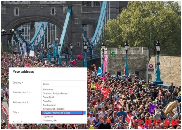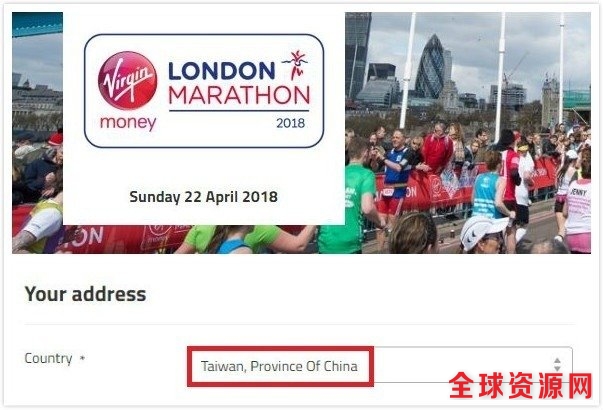 2018英国伦敦马拉松网路报名系统将台湾标示为“中国的一省”