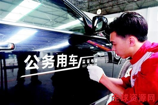 图为:昨日,省直机关汽车修理中心,几辆公车正在喷涂“公务用车”标识和监督电话。 楚天都市报记者魏铼摄