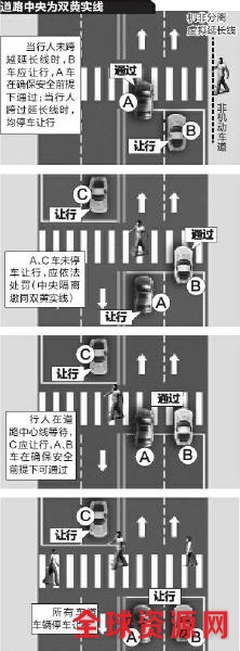 当行人已经通过一条车道之后,原先礼让的车辆可以在确保安全的前提下通过人行横道,而当行人站在道路中心线位置时,行人准备通过的车道车辆需要礼让行人。